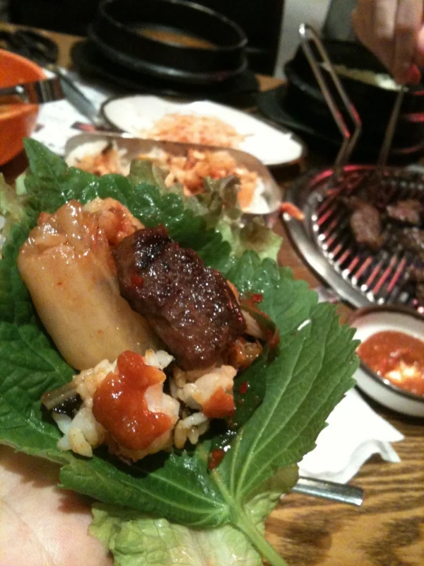 Wrapping the meat with 쌈장 (Sahm Jang - chili/soy-bean paste), kimchi and rice in 깻입 (Gget Nip - sesame seed leaf) and 상추 (Sang Choo - Korean lettuce).