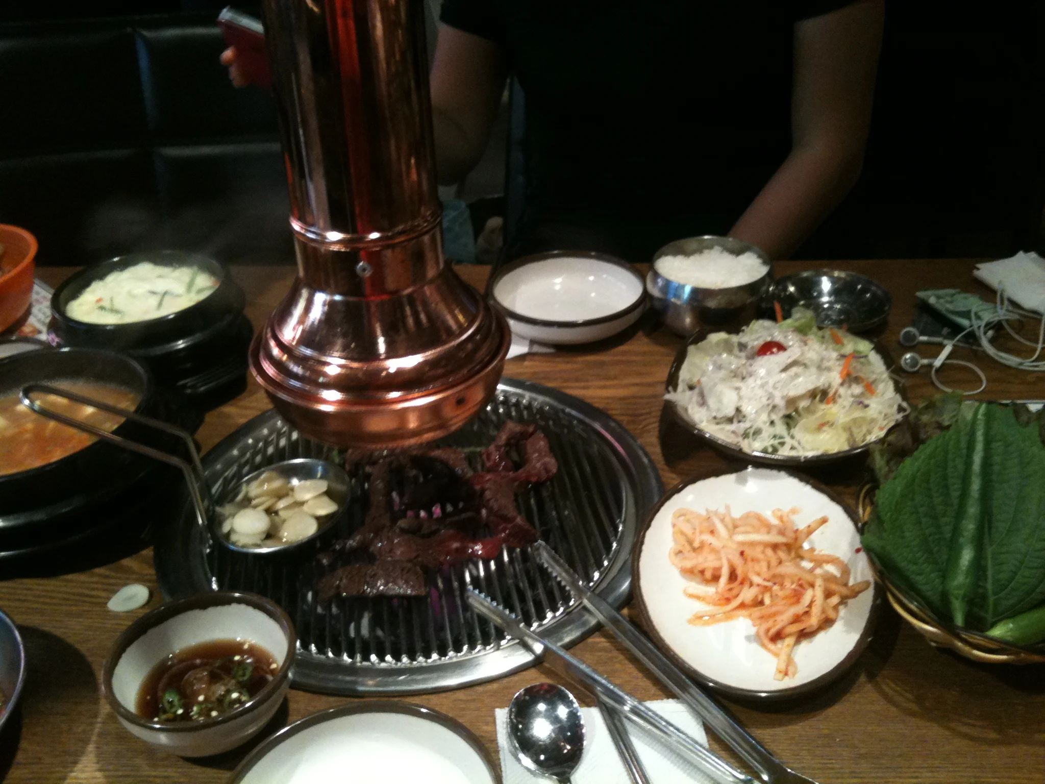 Cooked to medium-rare perfection with a pot of garlic sizzling in sesame seed oil on the grill. Make sure to ask for that if they don't have it on the table for you. There is a light soy-sauce with white onions and jalapeño dipping sauce for the meat too.