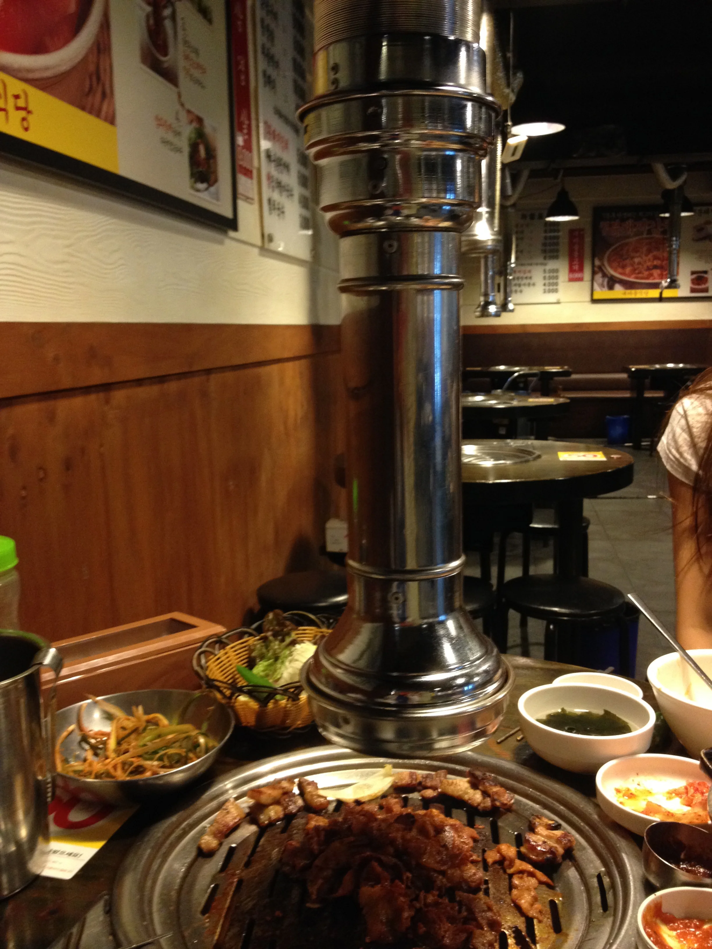 Love the smoke sucking vacuums Korean restaurants have to keep the place better ventilated. You can also get giant plastic bags here to put your belongings (jacket, purse, bags etc) in so they won't smell as much after you leave the restaurant!