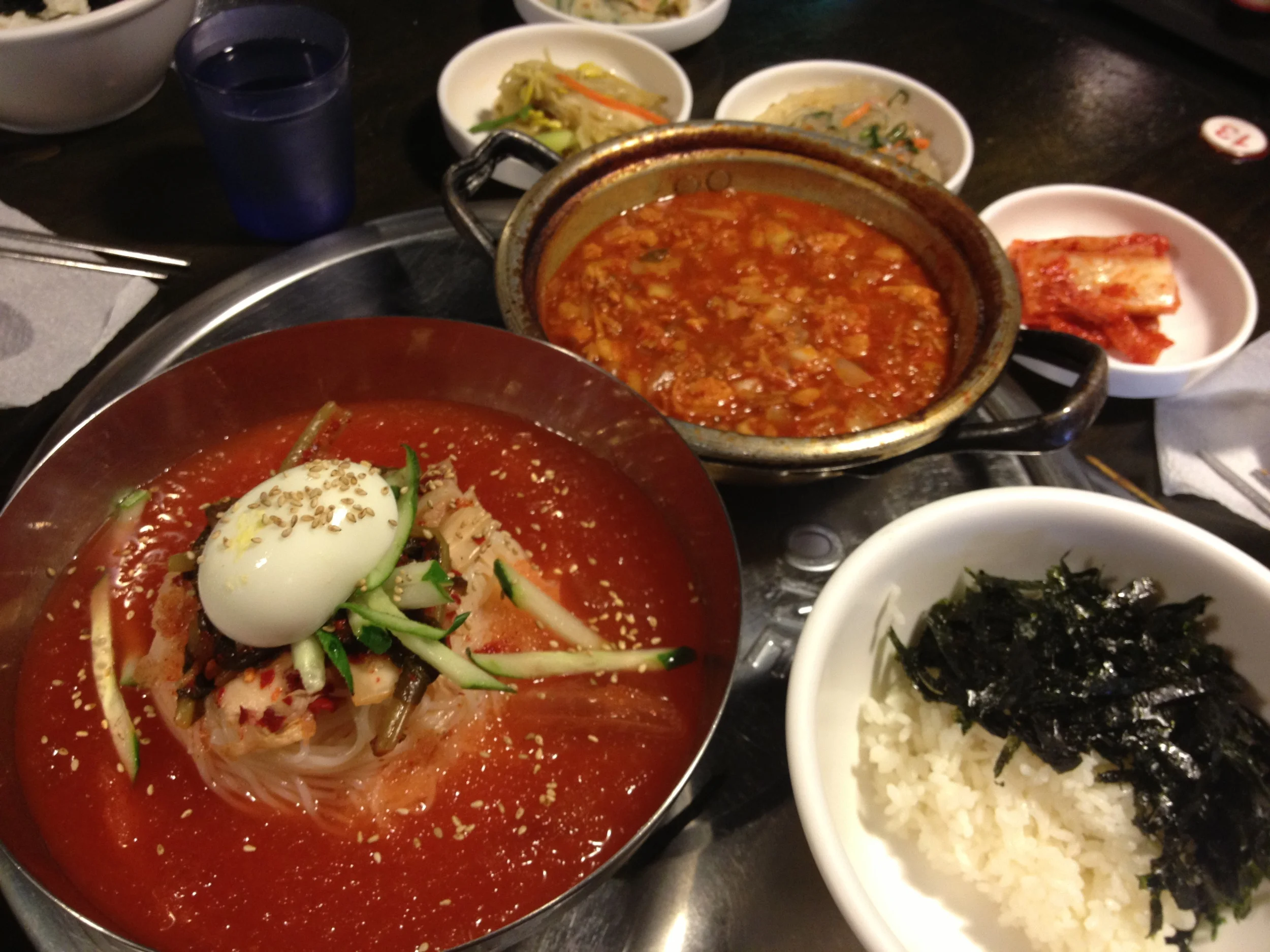 Breakfast of champions: Had the hot kimchi jiggae and the cold kimchi noodles (김치말이국수) to have a nice "balanced" meal of hot and cold dishes for breakfast one morning! Love that this place is 24 hours!