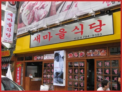 What? 새마을식당 (SehMael ShikDang) - New Town Restaurant. Known for their 7-minute kimchi jiggae and thinly sliced spicy pork bbq. They have other pork bbq items on their menu along with dwenjang jiggae and noodles.