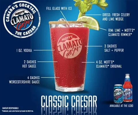 Here is a break-down of a delicious Canadian cocktail. The biggest difference between this and a Bloody Mary is the Mott's Clamato juice - a mix of tomato and clam juice, hence the name Clamato!