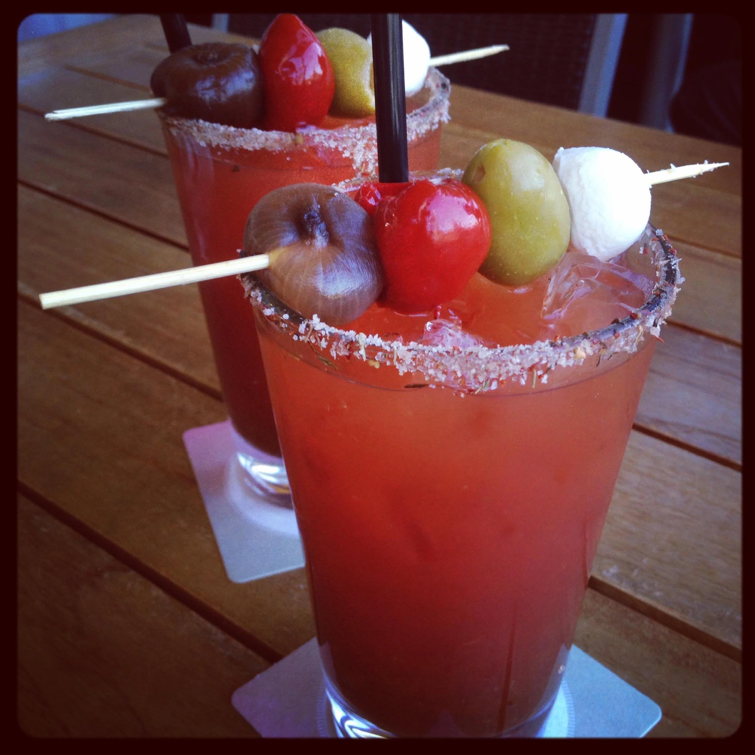Both very similar, crushed ice in a caesar with lemon, fresh horseradish and a prawn for garnish.