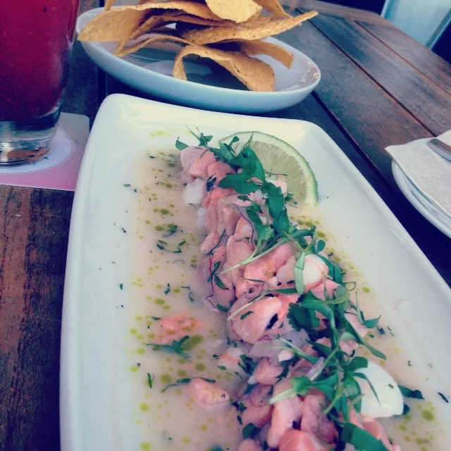 Ceviche - "lois lake steelhead, sustainably harvested prawns, red onions, thai basil, mint, cilantro, nuoc cham."