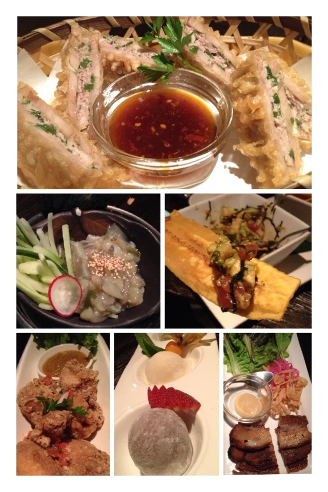 Top left-right: Turnip gyozas, takko (octopus) wasabi, tuna avocado with plantain chips, chicken wings, mochi ice-cream, pork belly lettuce wraps.