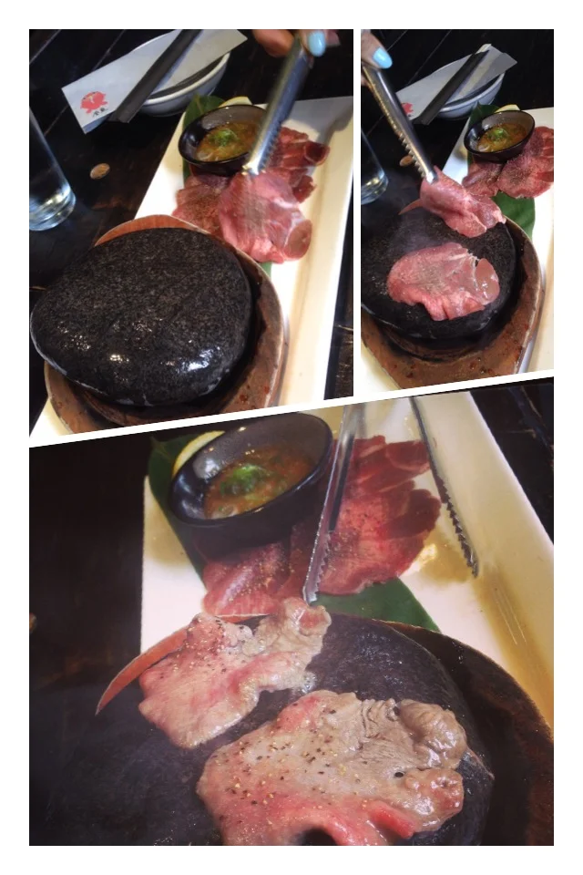 "STONE-GRILLED BEEF TONGUE SERVED WITH YUZU RED PEPPER PASTE AND GREEN ONIONS." Their stone-grilled kobe beef is also very popular and fun to grill on a hot stone at your own table.