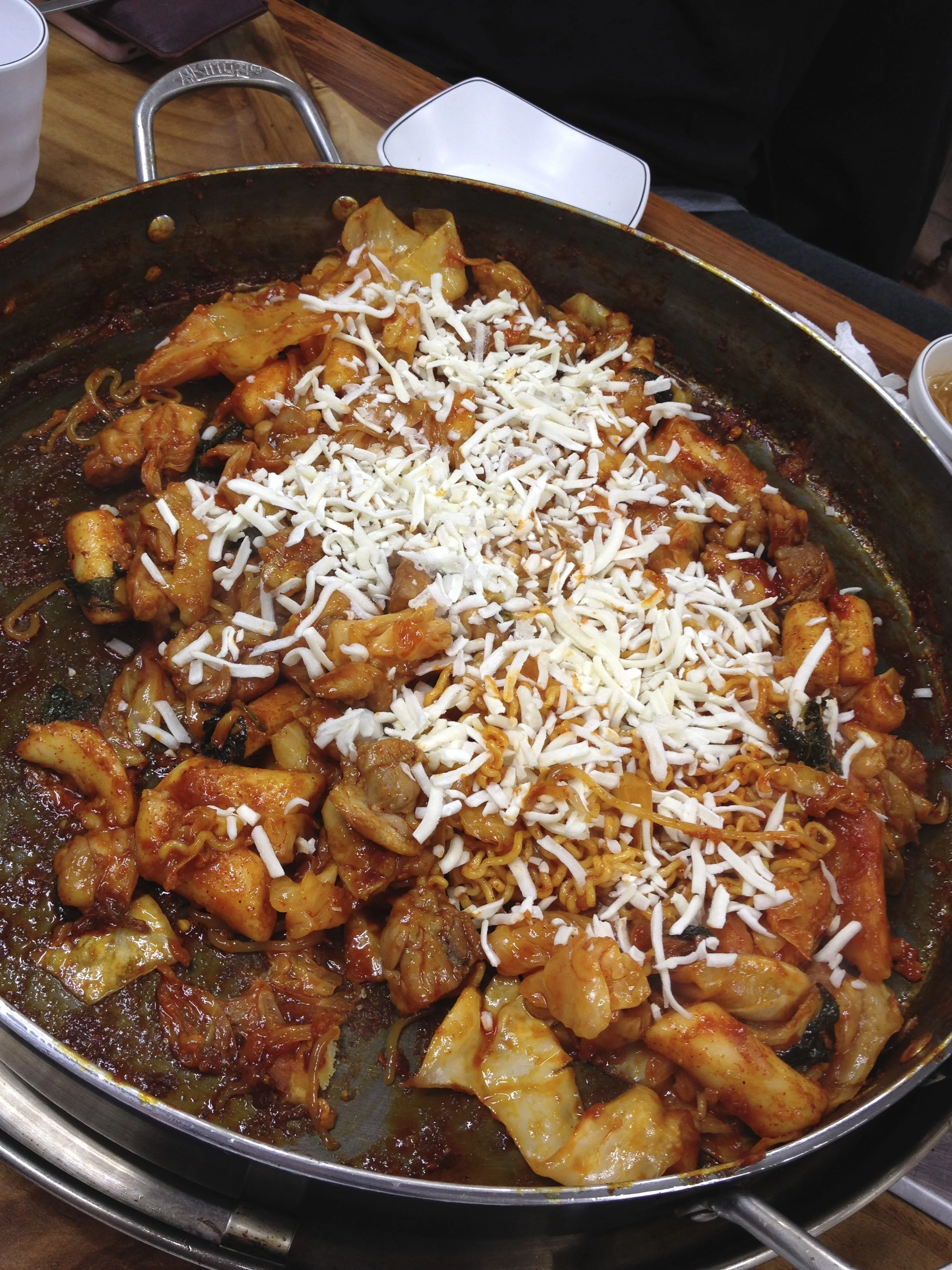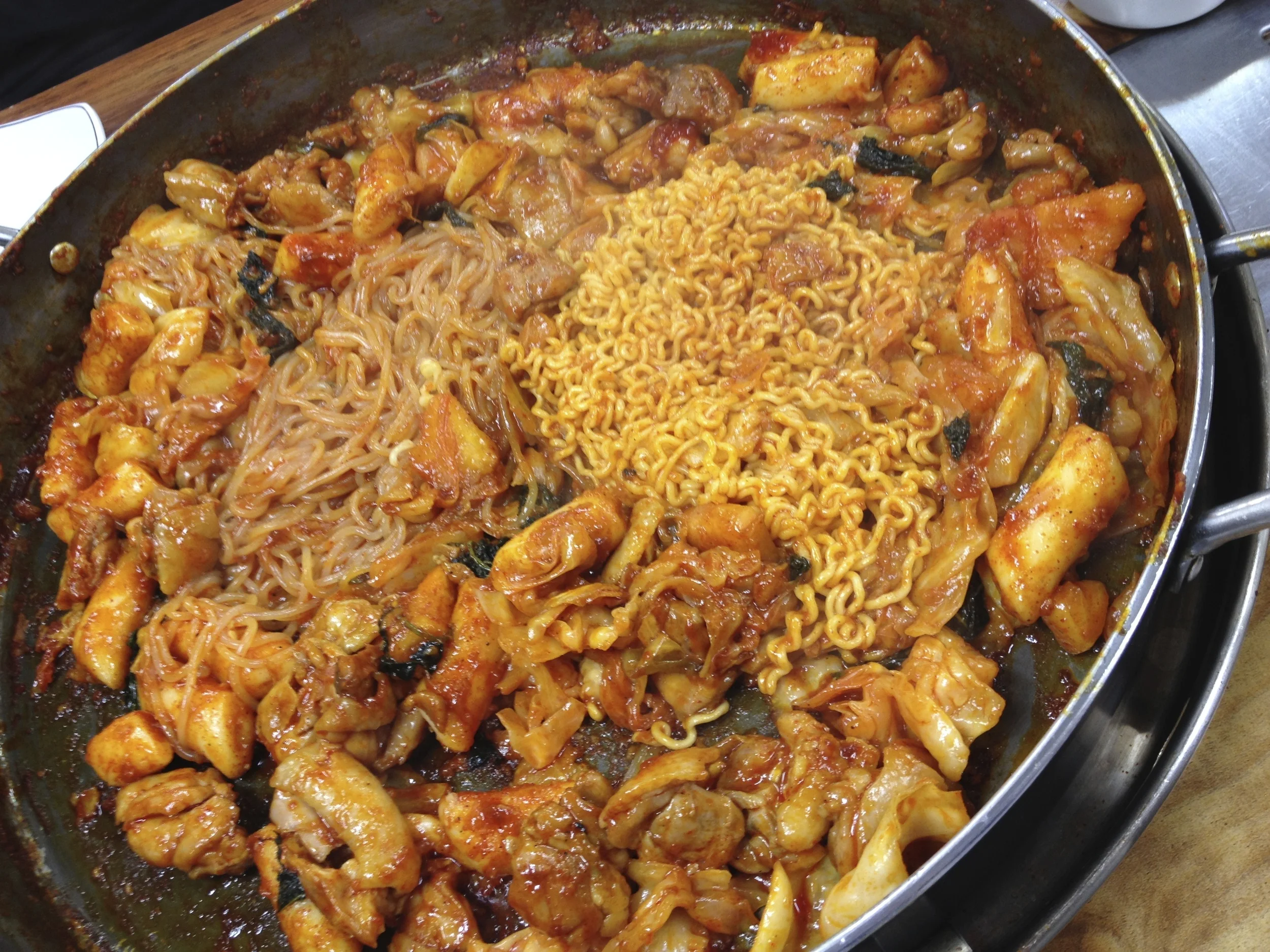 What? Korean food - spicy stir-fried boneless chicken and vegetables (cabbage, onions, sesame seed leaves) on a hot pan skillet with optional added rice cakes, sweet potato, ramen/potato starch/udon noodles topped with mozzarella cheese. Finished off with stir-fried rice in the pan.