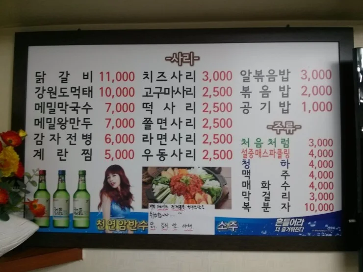 The menu in a nutshell: Per portion of dalkgalbi = 11, 000won. Cold Noodles for after the meal: 7000won. Giant dumplings: 7000won. Steamed Egg: 5000won. Sides to add in (sweet potato, rice cakes, noodles): 2500won each. Cheese: 3000won. Fish roe fried rice: 3000won. Fried rice: 2000won. Plain rice: 1000won.