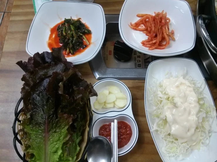 The sides here a minimal but you don't need to fill up on sides here as the meal is filling enough! The green onion side is super flavourful and delicious and the cabbage with mayo will help to cool off your tongue! In the winter, they give you a hot spicy soup on the side, and in the summer they give a refreshing cool vinegary cucumber side soup. Love the cool vinegary one.