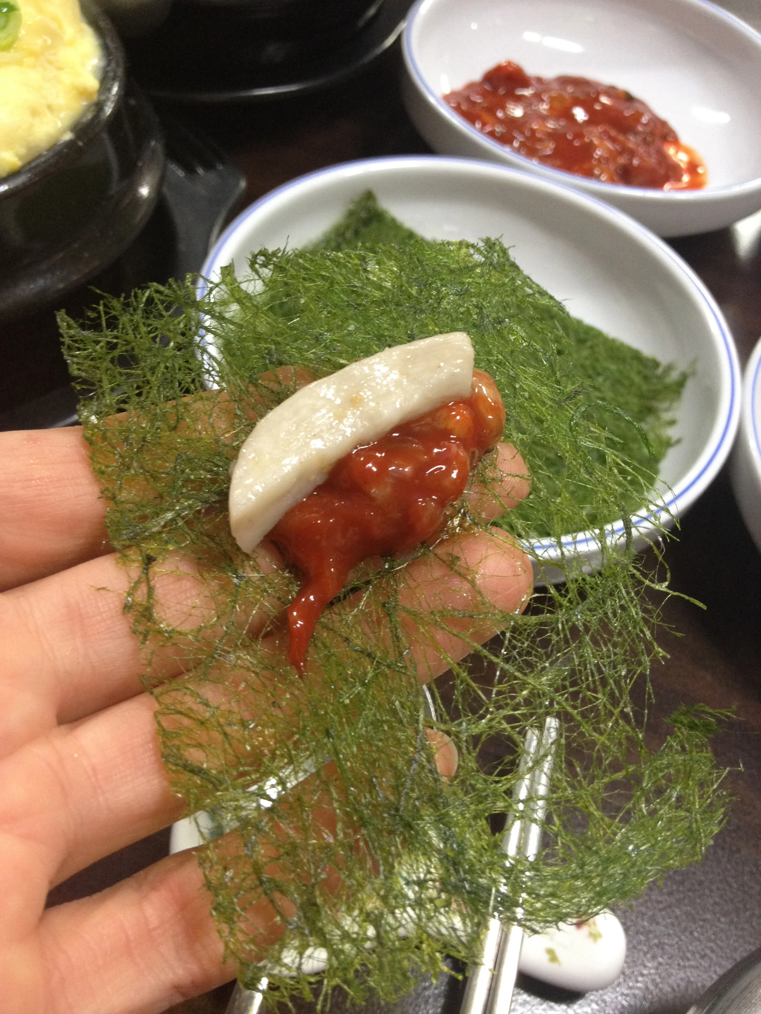 Another feature of the meal at this place is their special seaweed. It is a version of 파래김 (Pa-reh-gim), which is a type of seaweed prepared in a certain way.