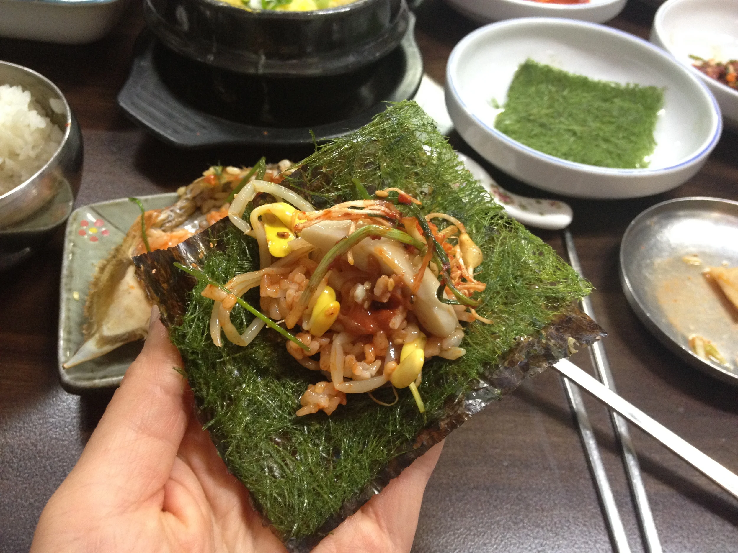 The seaweed is extremely delicate, airy and melts in your mouth. It almost has the consistency of Korean hanji paper, but melts in your mouth like cotton candy! You can put the other delicious side dishes like mushrooms and raw oysters in a spicy sauce on and enjoy the different textures and flavours together.
