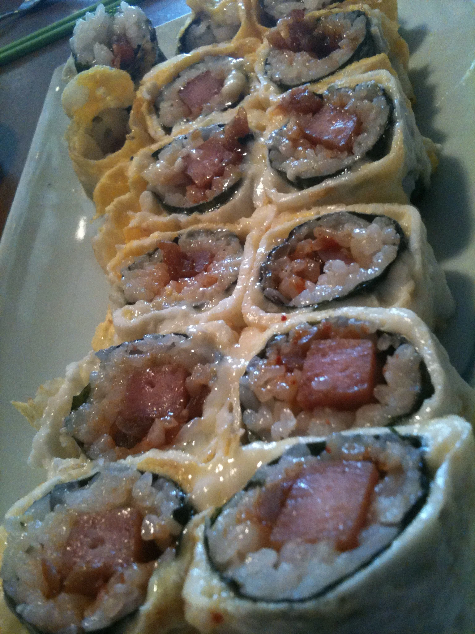 Spam rolled with an egg wrap.