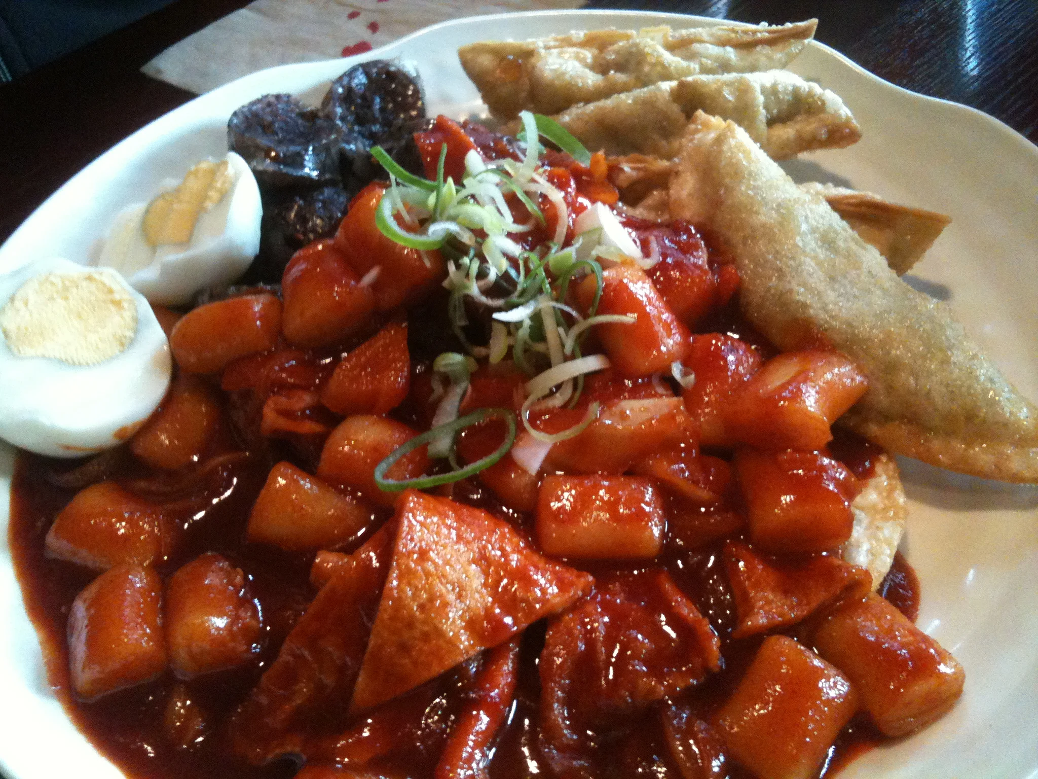 A combination of spicy rice-cakes (dukbokki),dumpling (mandoo), blood sausage and hard boiled eggs. I find that this version of dukbokki is a bit too spicy even for me...so I prefer other versions of dukbokki better.