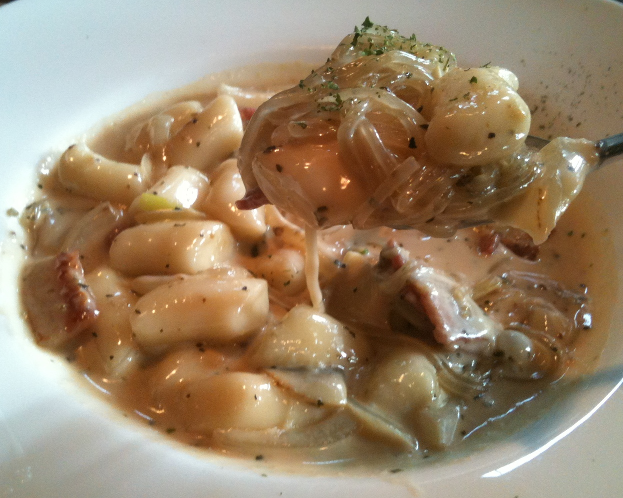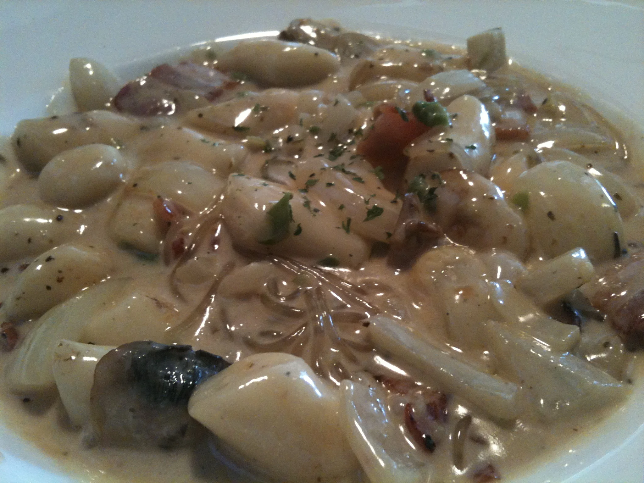 A creamy yet savoury dish of rice cakes with slices of pork bacon, mushrooms, glass noodles and onions.