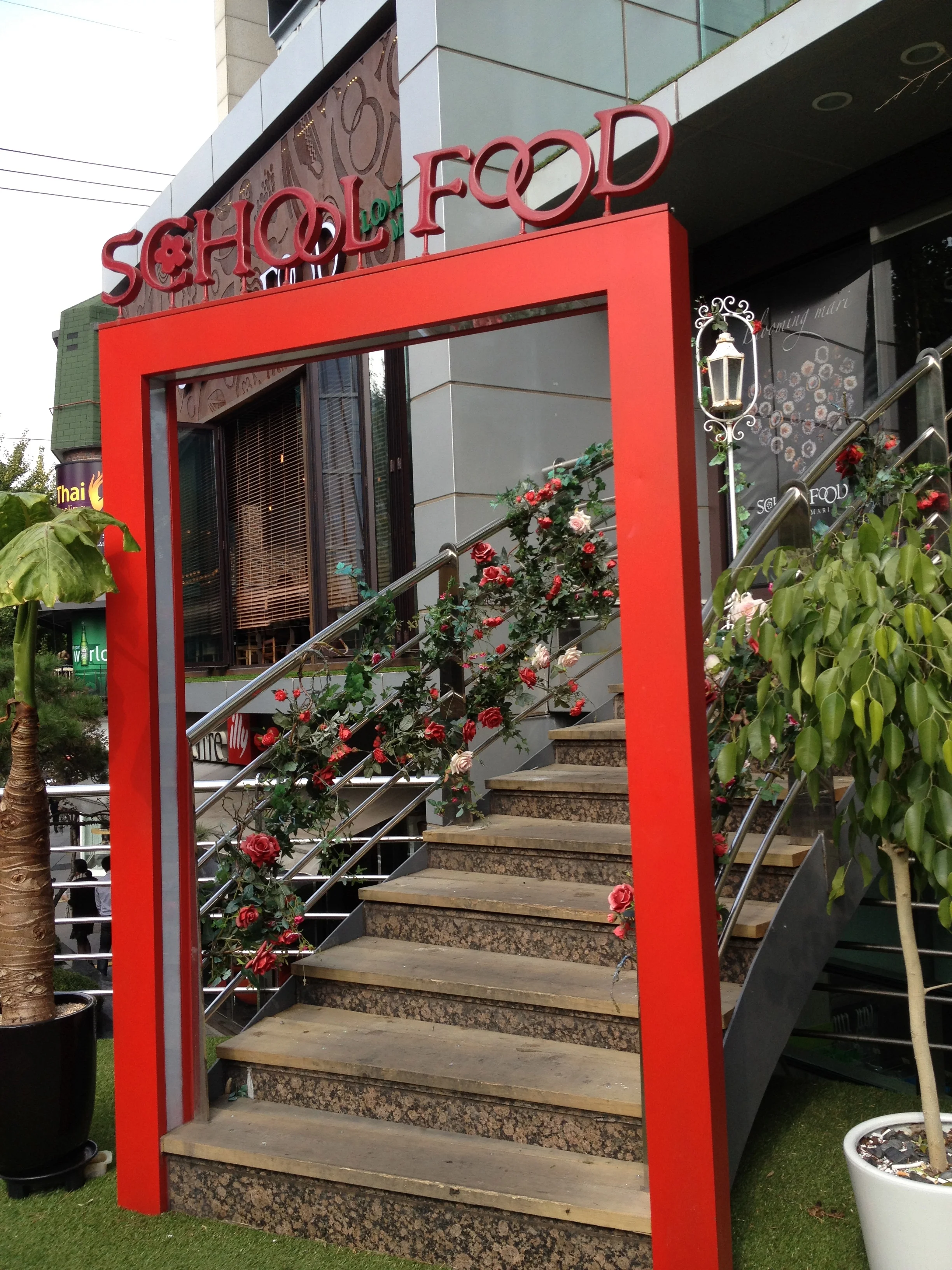 Directions: Come out of Shinsa Station, Exit 8. Walk straight ahead for 50metres until you see a Missha cosmetics store on the corner. Turn left on the main Garosugil street. You will see School Food on your right on the 2nd floor immediately.